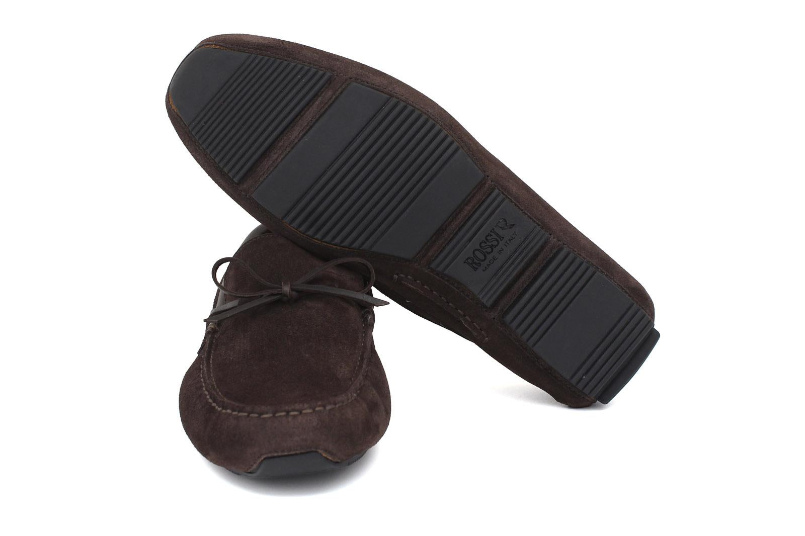 Drive in dark brown suede with leather inserts and rubber sole with inserts