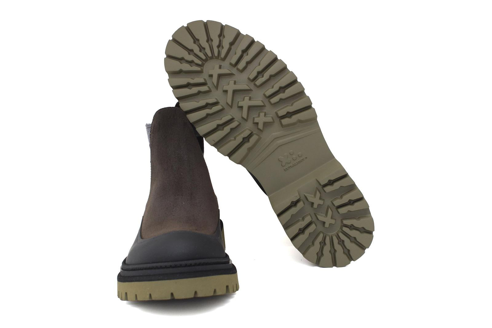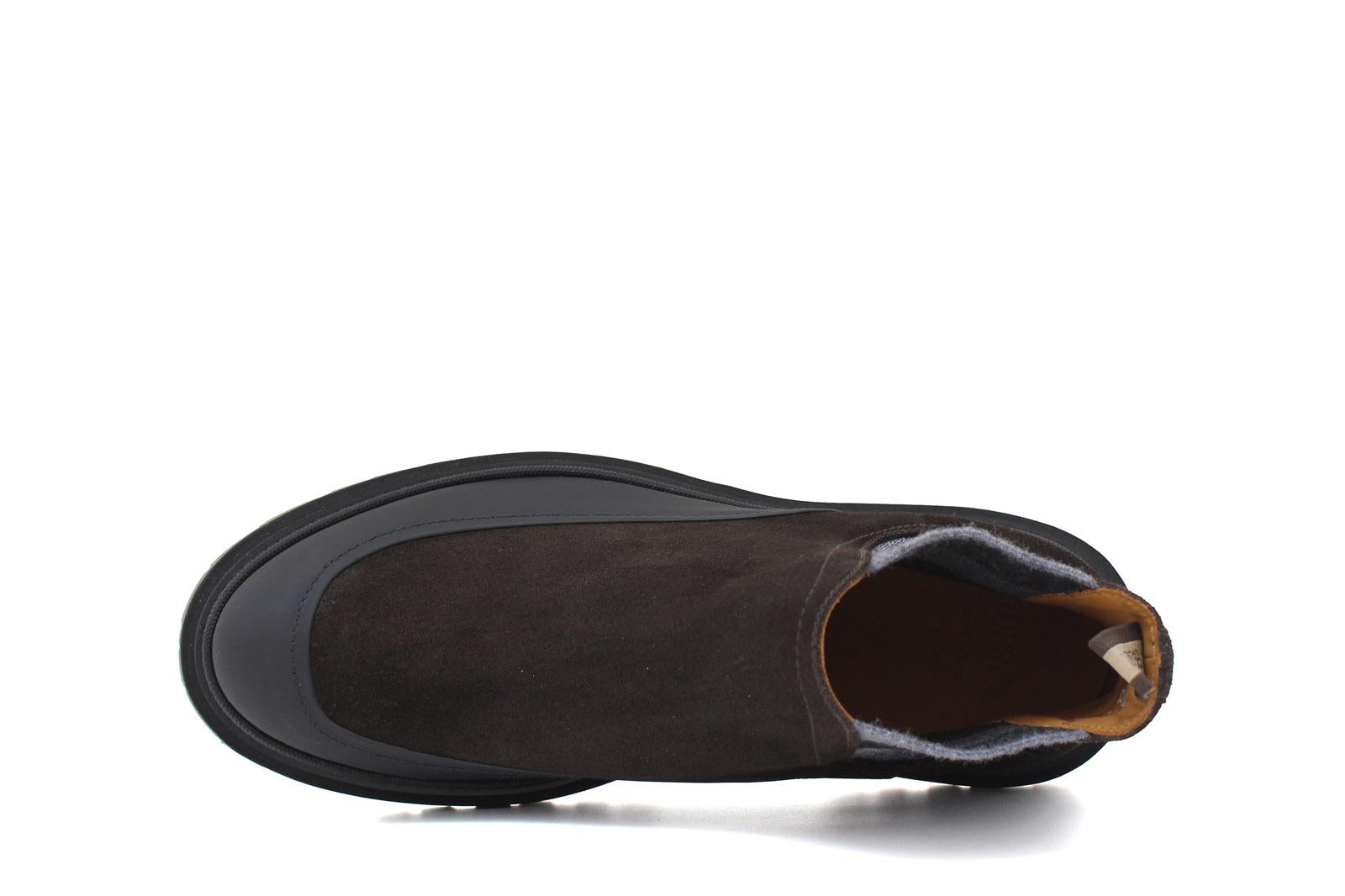 Beatles-style ankle boot with dark brown greased suede upper and rubber insert, light and comfortable for a casual and sophisticated outfit
