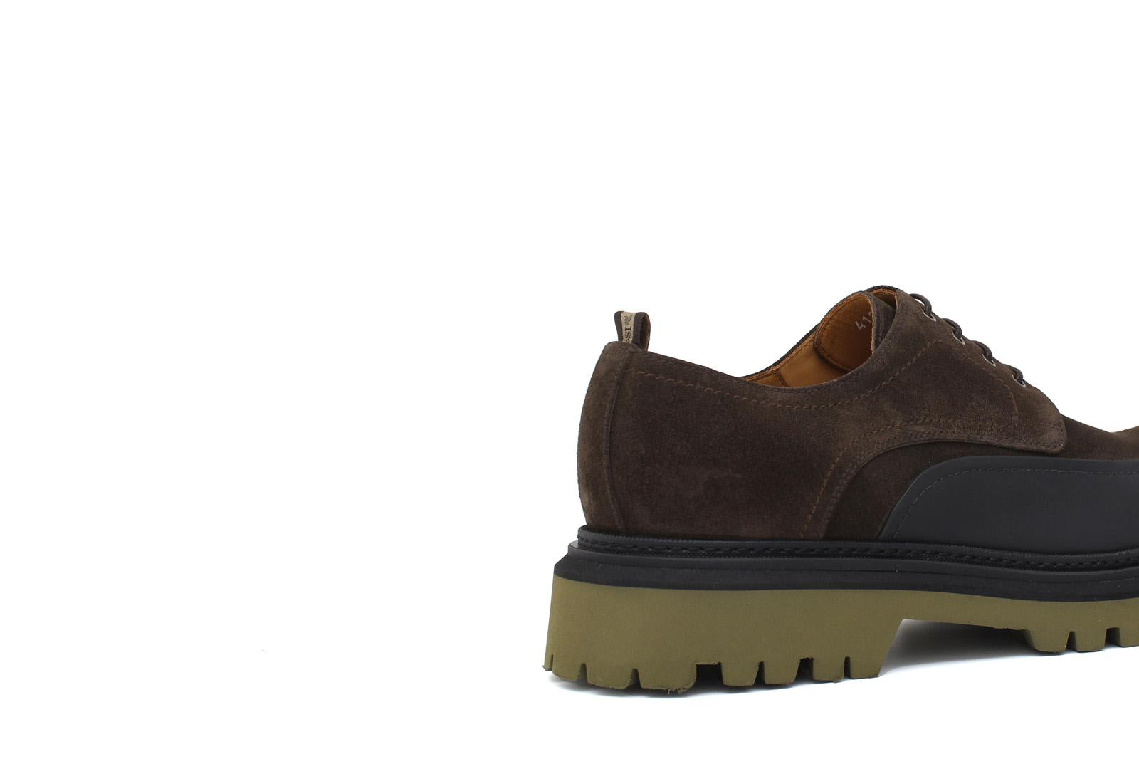 Derby with dark brown greased suede upper and rubber insert, light and comfortable for a casual and sophisticated outfit