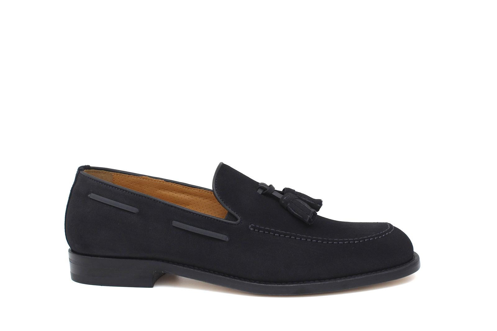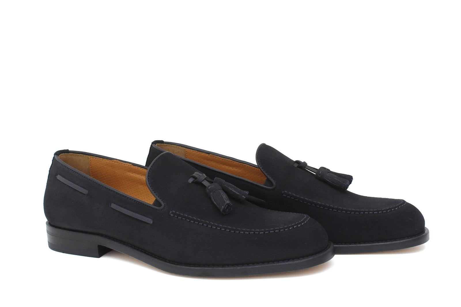 Mocassino con nappine in camoscio blu consigliato per un outfit formale e di alto livello